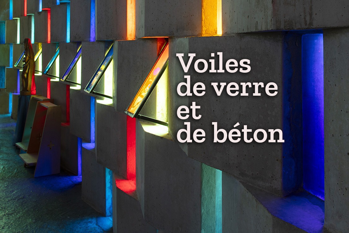A la limite du vitrail, le verre se libère ici du plomb traditionnel ou du sertissage en béton et se soumet à l’architecture pour, avec les éléments en béton, devenir voiles.